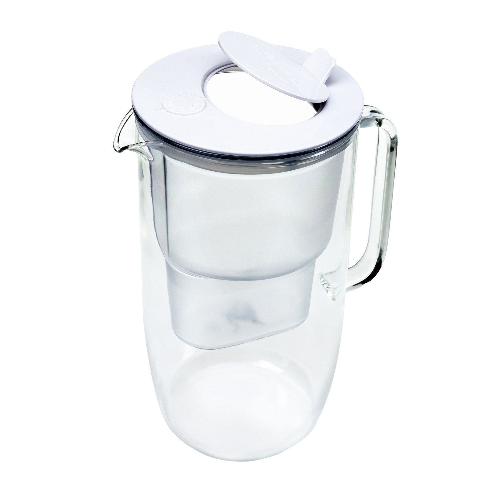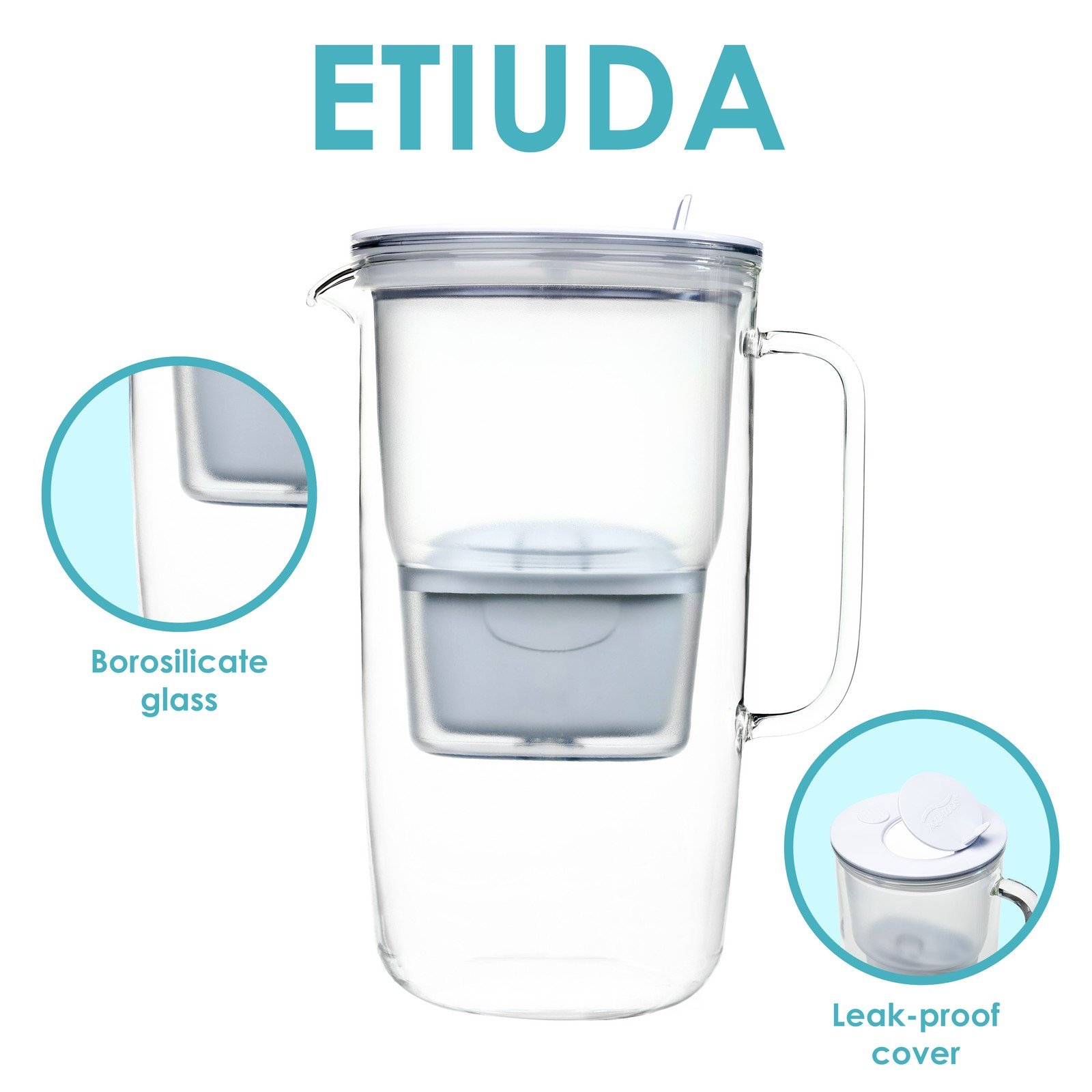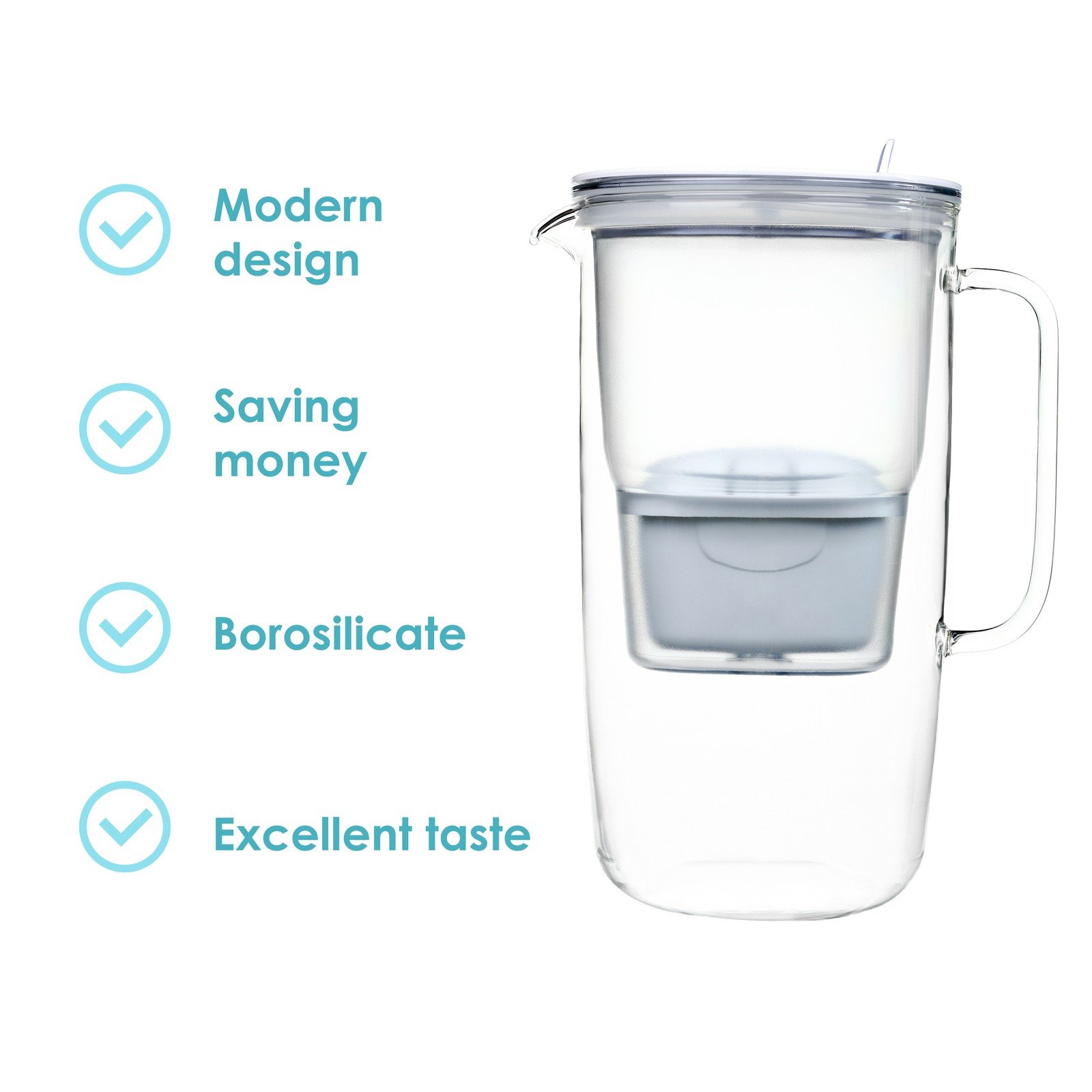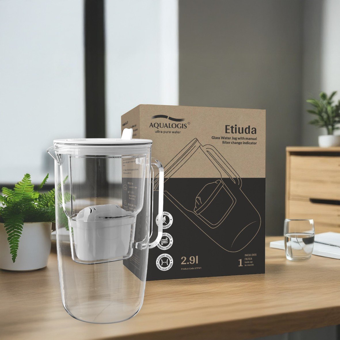 Glass Water Filter Jug Aqualogis Etiuda – White is manufactured by Aqualogis and made from borosilicate glass. It has a total capacity of 2.9 liters, with a filtered water capacity of 1.7 liters. The jug is compatible with the PURE+ cartridge, and it includes 2 cartridges. The design allows for easy refilling without removing the lid, and the borosilicate glass construction is resistant to sudden temperature changes, making it durable and eco-friendly.