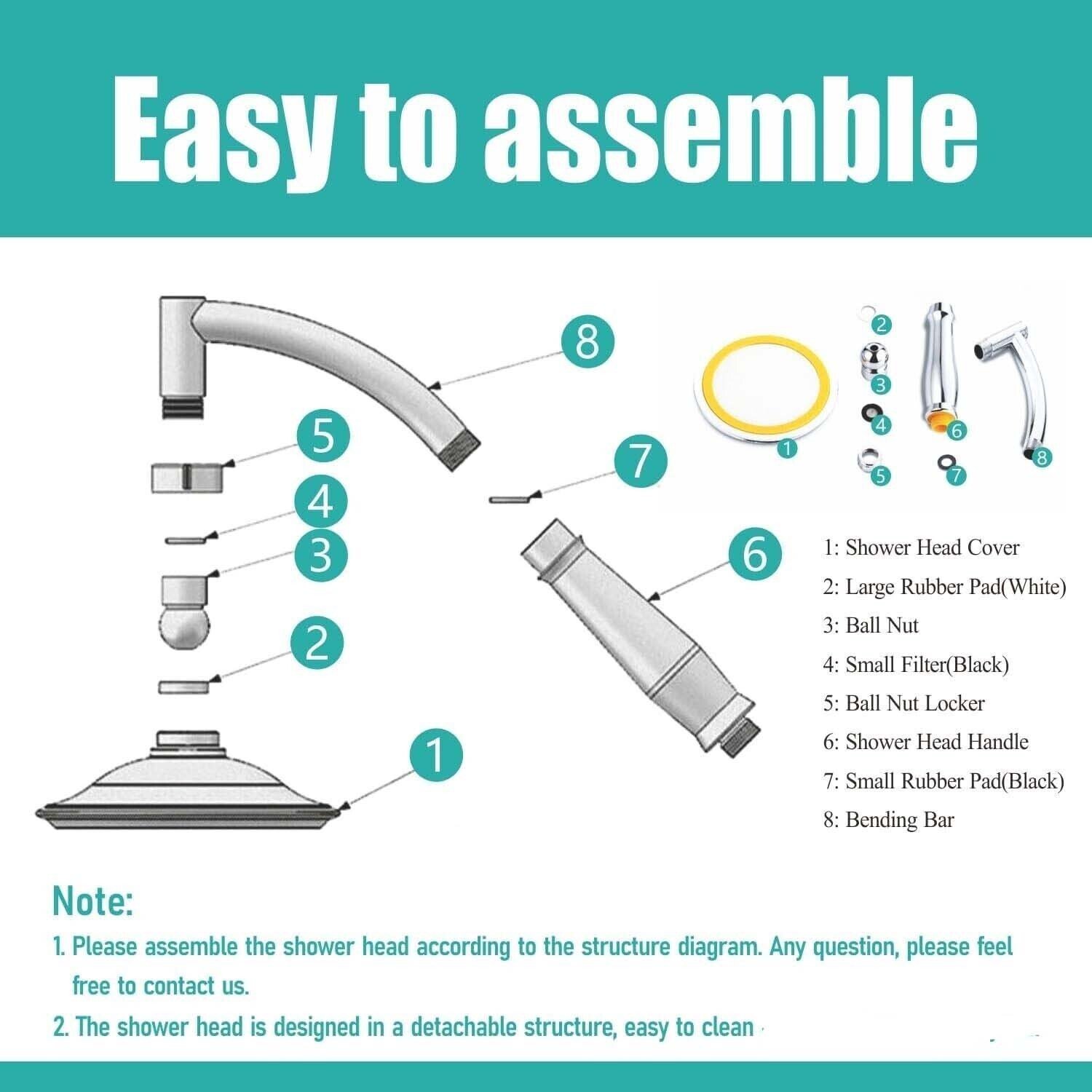 This shower head operates in a rainfall mode that mimics natural rainfall. It is designed with a G1/2″ BSP connection and has a round shape with a size of 6 inches. Installation instructions are included, detailing the installation of a white washer and a small filter. The package contains one shower head with a built-in filter.