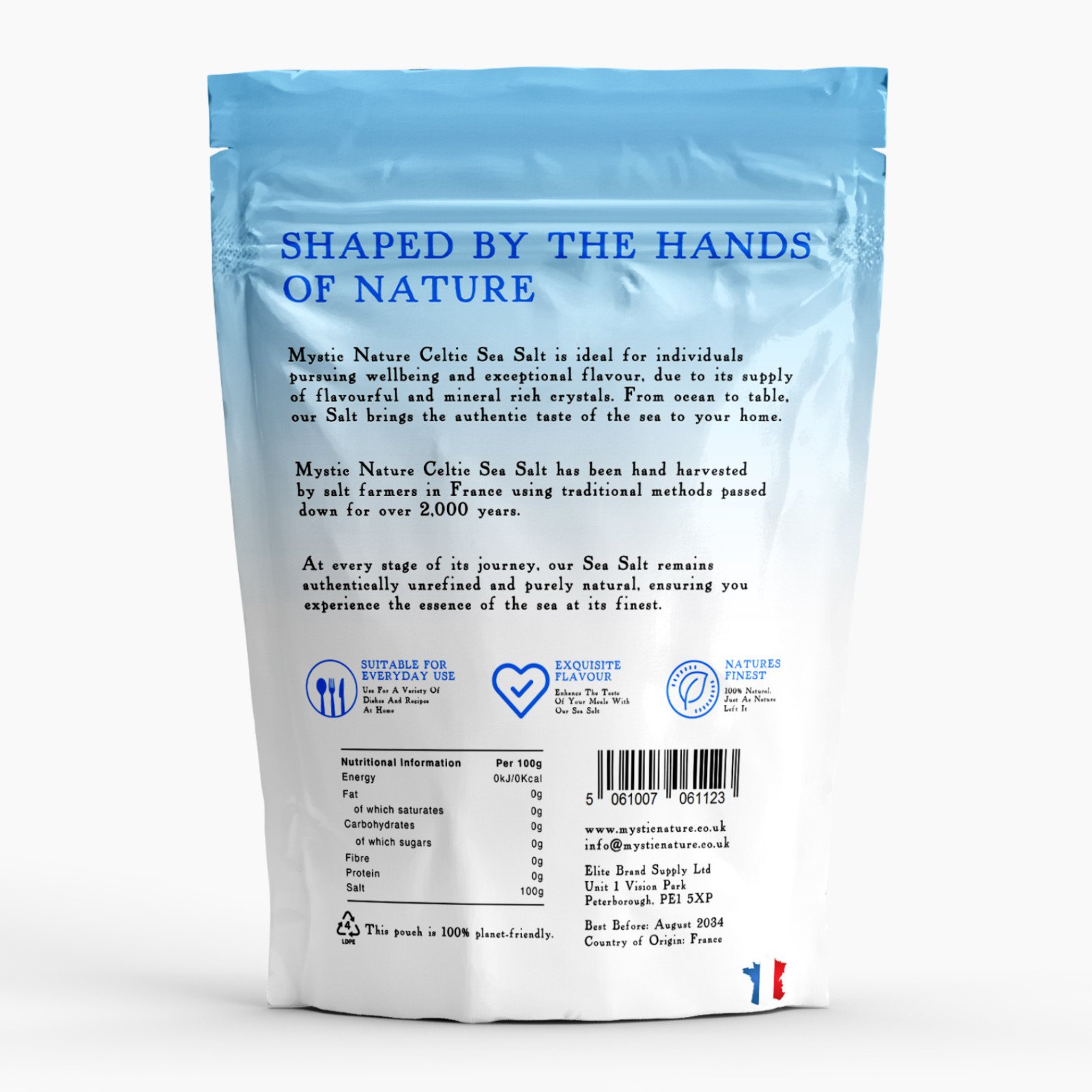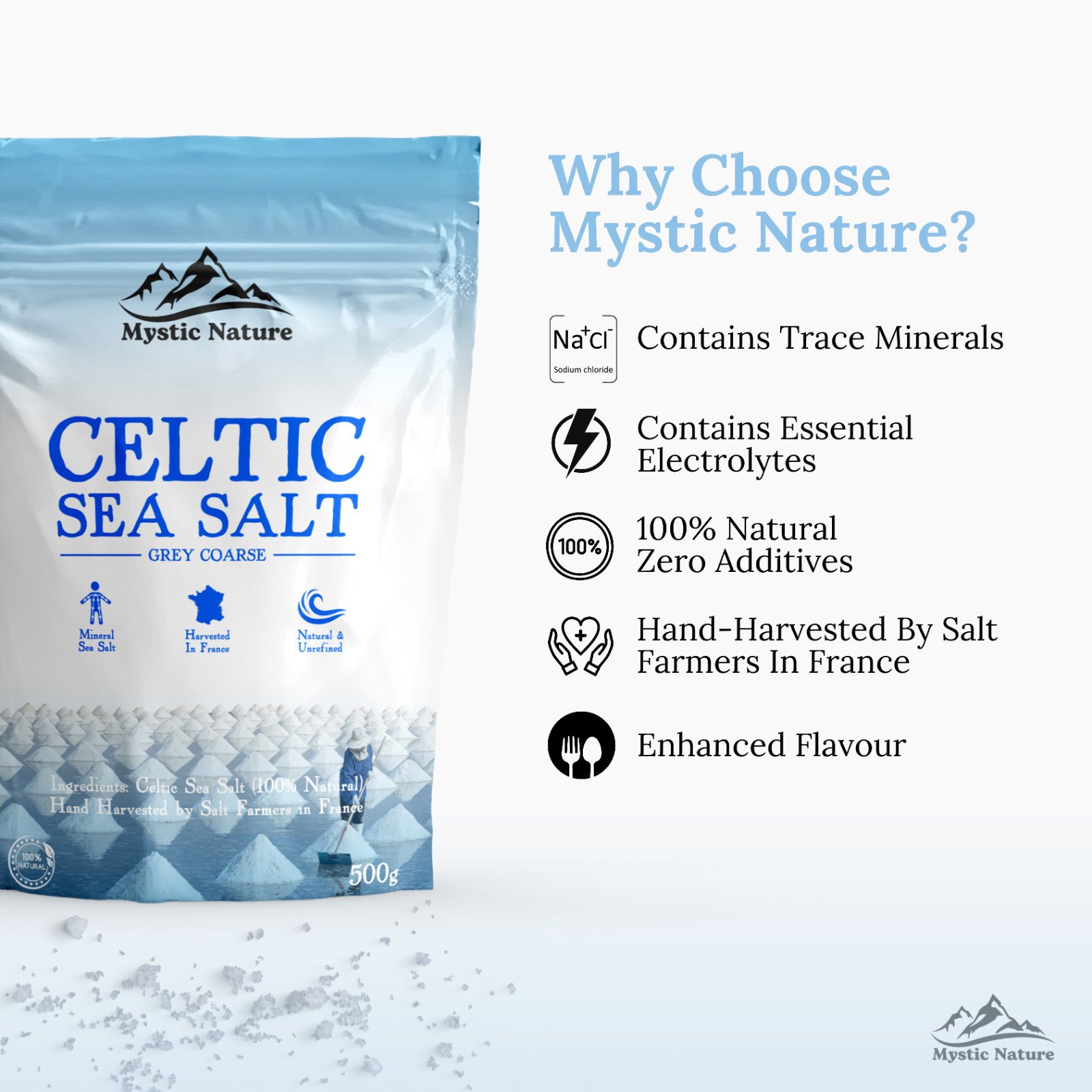 Mystic Nature Celtic Sea Salt is a natural source of essential minerals and trace elements. It is unrefined and free from any added ingredients, ensuring its purity and authenticity. The salt is hand harvested by skilled farmers in Brittany, France, capturing the essence of the sea.