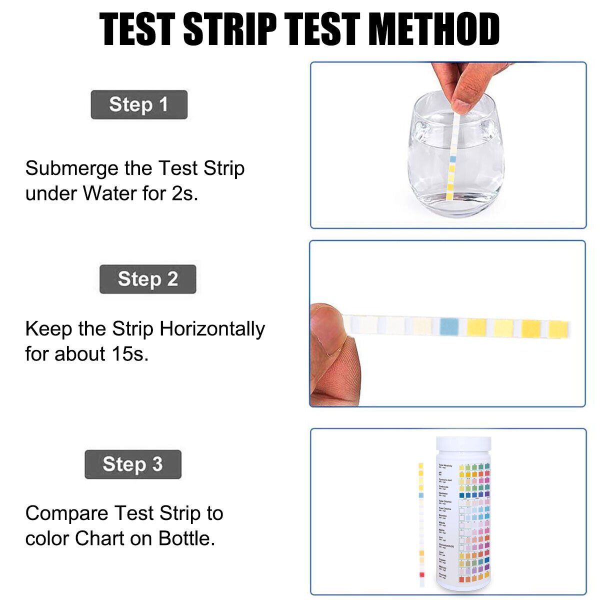 The test method involves immersing the strip in the water sample for 1-2 seconds, then waiting 60 seconds to read the results. Water samples should be taken at room temperature, and the strips must be stored in a dry place, away from light, with specific temperature guidelines for optimal shelf life. The strips have a shelf life of 24 months when unopened and 12 months after opening.