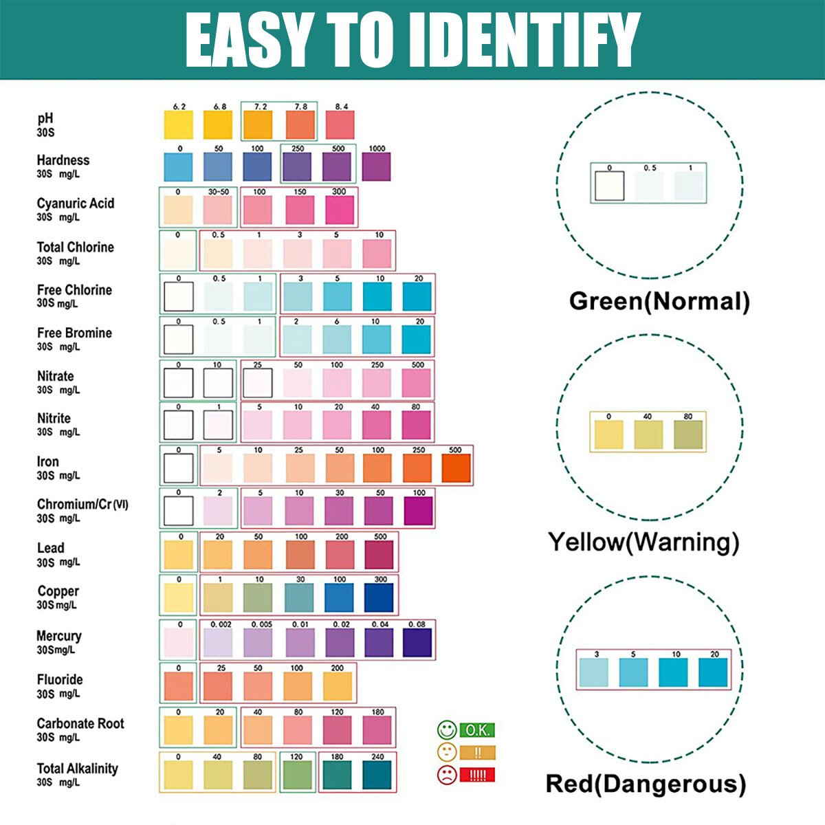 • 16 indicators tested, including pH, iron, copper, and nitrate