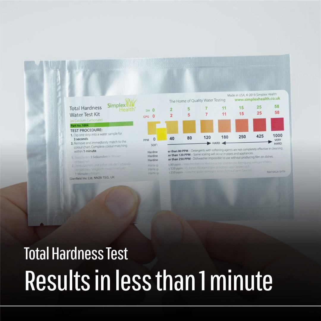 SimplexHealth Total Hardness test strips are designed to measure the hardness of water, with a range of 0ppm to 1000ppm (mg/l). The strips provide a simple dip-wait-read testing method that yields accurate results in less than one minute. The product is suitable for testing fresh water samples from various sources, including taps, wells, and ponds. Each package contains 10 strips stored in a resealable aluminium pouch for protection.