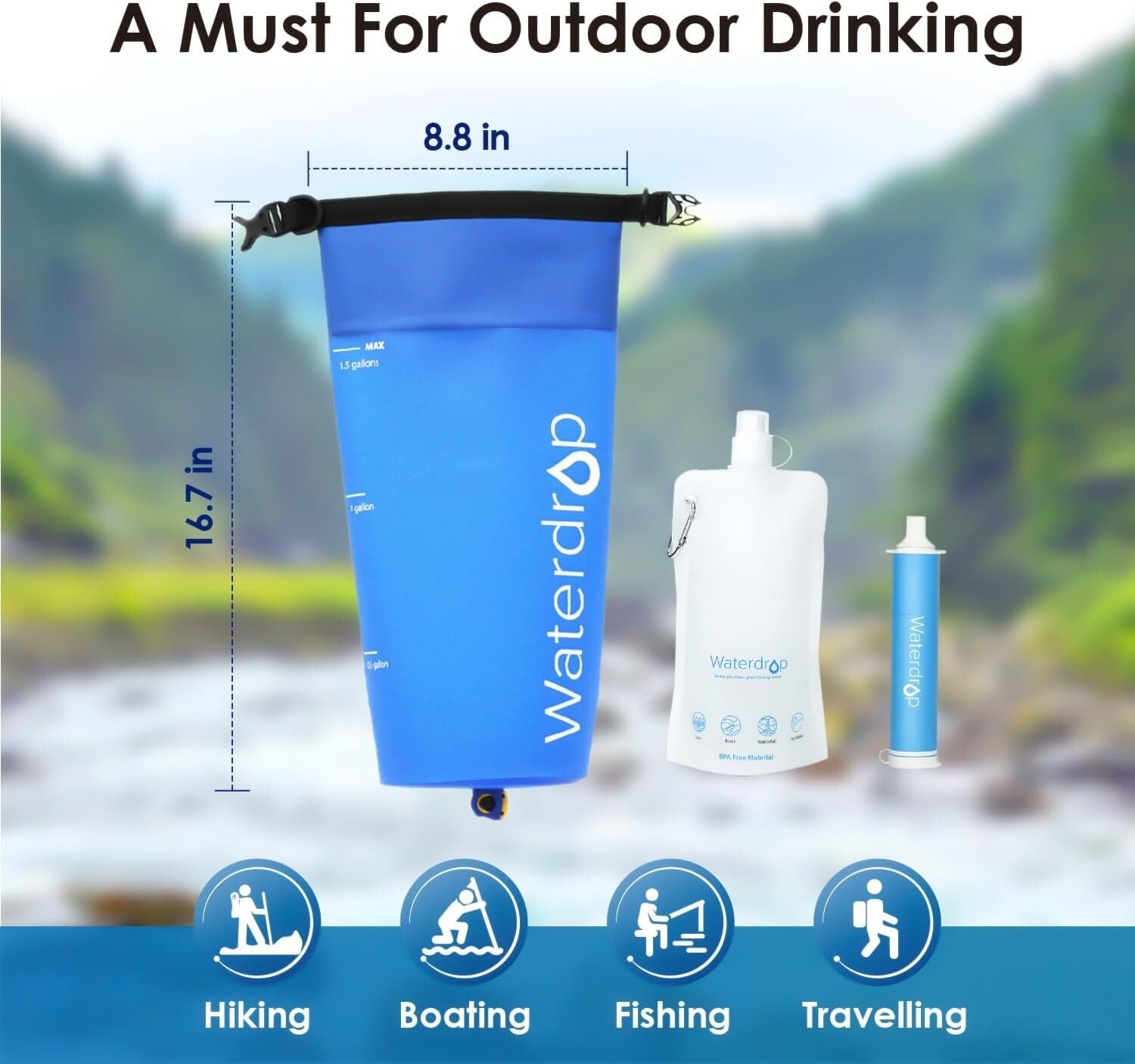 The product includes a personal water filter straw, a 1.5-gallon portable foldable gravity-fed water bag, and a 20 oz BPA-free reusable collapsible water bag. The filter straw and the small white bag are packaged together, while the blue gravity bag is in a separate package. The filter effectively reduces harmful substances, utilizing high-grade coconut shell activated carbon fiber to improve odor and taste, ensuring water safety for a better drinking experience. It can be used with water bags or connected to water bottles for convenient access to clean drinking water.