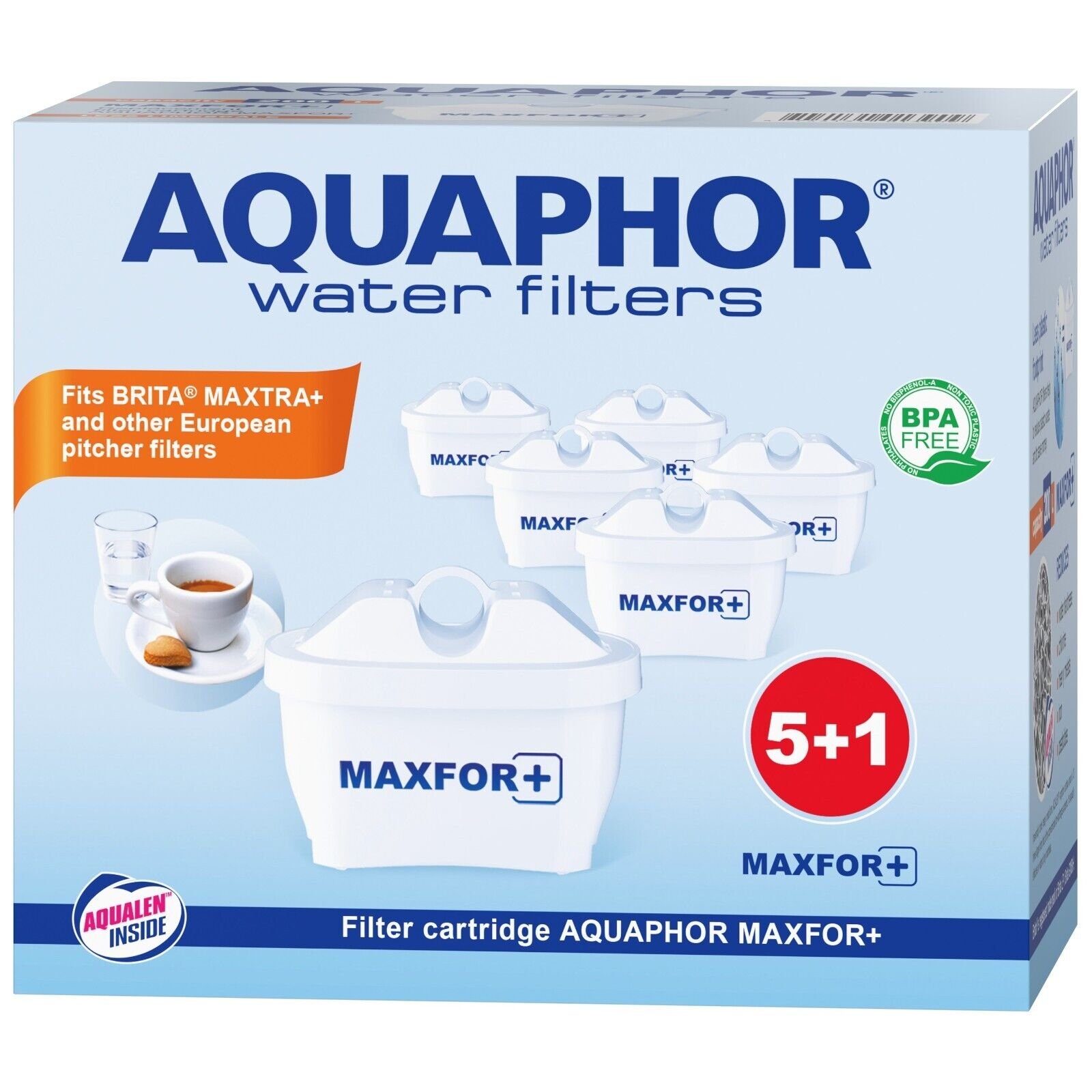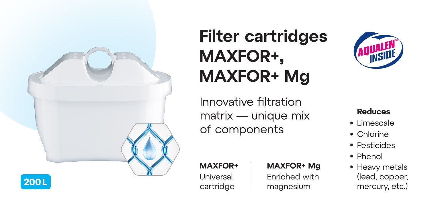 AQUAPHOR Replacement Filter Cartridges (Pack of 6) are designed for Maxtra™-compatible systems, including Brita® Marella jugs and other Maxtra™ pitchers. These cartridges utilize AQUAPHOR’s AQUALEN ion-exchange technology to effectively reduce chlorine, limescale, heavy metals, and impurities, providing clean water for drinking and cooking.